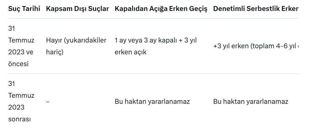 31 Temmuz 2023 tarihi ve öncesinde işlenmiş tüm suçlardan hüküm giymiş hükümlüler bu haktan faydalanacaktır. Ancak aşağıdaki suçlar kapsam dışında tutulmuştur; (Yeni düzenlemeden faydalanamazlar)